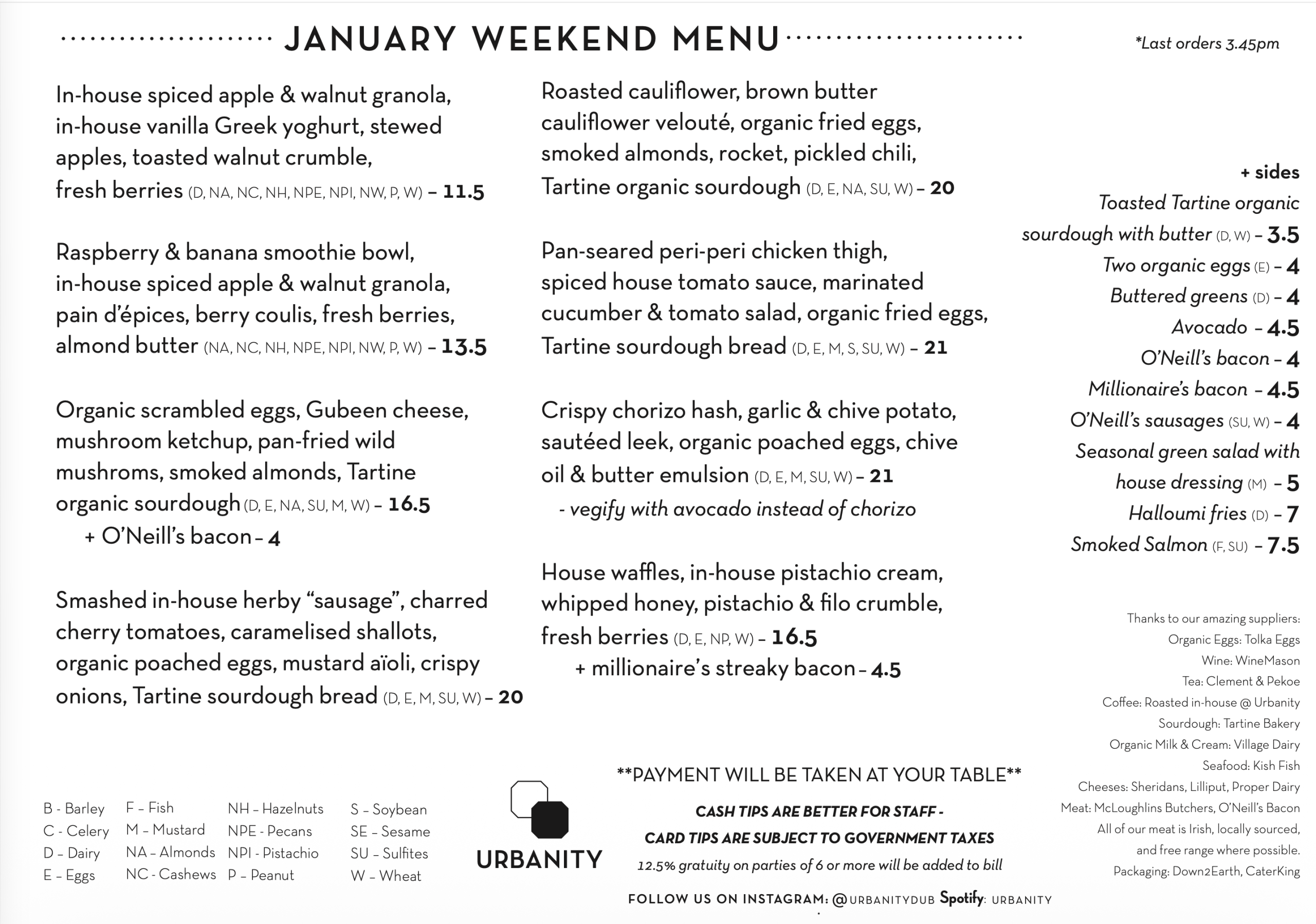 C – Celery, D – Dairy, E – Eggs, F – Fish, M – Mustard,  MO – Molluscs, NA – Almonds, NC – Cashews, NH – Hazelnuts, NPE – Pecans, NPI – Pistachio, NW – Walnuts, P – Peanut, S – Soybean, SE – Sesame, SU – Sulfites, W – Wheat